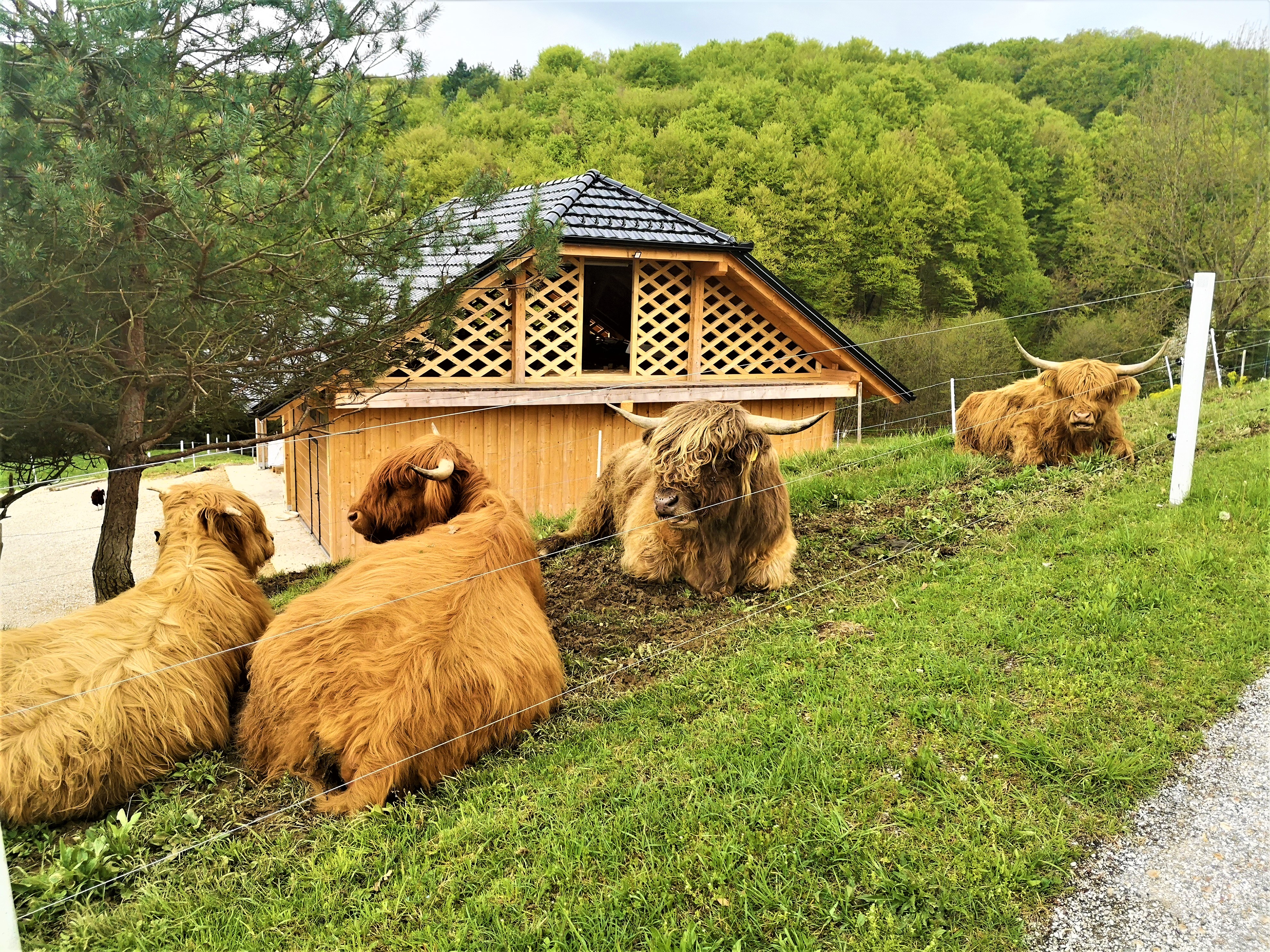 For this purpose, three hectares of agricultural land were purchased, a charming hayrack was built, and Scottish cattle, along with various other animals, were introduced to the property. Villa Hojnik is situated on a small ecological farm where Scottish cattle graze freely. To ensure better use of the villa and regular maintenance, we decided to rent it out to guests looking for an escape from daily life, seeking peace and relaxation.